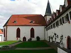 Nach der Renovierung des Propsteigebäudes,[23] des Konventbaus und des Refektoriums wurde der alte Hospitalsaal durch eine neue Aula ersetzt. Als Ersatz für die alte Wohnung im Konventbau erhielt der Gemeindepfarrer ein Pfarrhaus unmittelbar neben dem Kloster. Schließlich wurde der „Neue Bau“ dem Komplex hinzugefügt und am 16. Juni 1962 das „Evangelische Jugendzentrum Kloster Höchst“ eröffnet.
