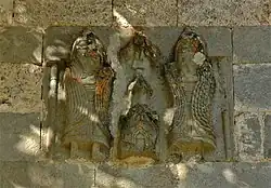 In der Skulpturengruppe an der Ostwand der Kirche sind zwei Männer dargestellt. Sie zeigen auf ein zwischen ihnen aufgestelltes Kirchenmodell und eine Taube mit halb ausgebreiteten Flügeln zeigen.[1] Möglicherweise zeigt die Dachbedeckung des Modells das ursprüngliche Aussehen der Kuppel der Kirche. Die beiden Männer sind sehr detailreich dargestellt. Ihre gepflegten Vollbärte und die großen mandelförmigen Augen tragen individuelle Züge und sind fein ausgearbeitet. Beide Männer tragen unterschiedliche Mönchsgewänder. Offensichtlich ist die rechte Figur reicher als die linke. Möglicherweise stellen sie den Gründer und ersten Klostervorsteher sowie seinen Assistenten dar.[3]