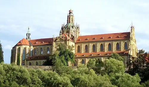 Die Abteikirche entstand als romanische Basilika im 12. Jahrhundert. Das heutige Aussehen im Stile der böhmischen Barockgotik gestaltete in den Jahren 1712 bis 1726 der Baumeister Johann Blasius Santini-Aichl. An der Südseite befindet sich ein Teil des ehemaligen Konvents und der Prälatur, im Süden der neue Konvent, entworfen von Kilian Ignaz Dientzenhofer. Das Innere der Kirche wurde von den Brüdern Cosmas Damian und Egid Quirin Asam und dem Bildhauer Matthias Bernhard Braun gestaltet. Die Orgel wurde von Johann Leopold Burkhardt in den Jahren 1726–1728 erbaut.[1]