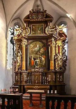 Um das Jahr 1714 erfolgte unter dem Würzburger Fürstbischof Johann Philipp von Greiffenclau zu Vollraths eine durchgreifende bauliche Erneuerung, bei der dem Kirchengebäude durch Hofbaumeister Joseph Greissing ein neuer Dachstuhl mit westlichem Dachreiter aufgesetzt wurde.[4][5] Der ebenfalls von Greissing angefertigte Glockenstuhl datiert inschriftlich auf 1714. An den Mauerkronen und über den Gewölben sind Brandspuren zu finden, deren Alter zwar nicht geklärt ist, die jedoch augenscheinlich vor dem barocken Dachwerk datieren. Im Chor wurde in jener Epoche ein barocker Hochaltar mit den Giebelwappen der Würzburger Fürstbischöfe Julius Echter von Mespelbrunn, als Ehrung an den Universitätsstifter, und Johann Philipp von Greiffenclau zu Vollraths, als Regent, aufgestellt sowie eine Kanzel angebracht. Das Altarblatt zeigt Mariä Himmelfahrt in der Art des Oswald Onghers, seitlich flankiert von den Skulpturen Johannes Evangelist und Johannes Baptist als Namenspatrone Greiffenclaus. Ein wertvoller Seitenaltar aus der Zeit um 1750 rahmt eine Madonna aus der Zeit um das Ende des 15. Jahrhunderts, die in der Barockzeit neu gefasst wurde. Unter den Grabdenkmälern ist das figürliche Grabdenkmal des Heinrich von Seinsheim († 1345) von würzburgischer Herkunft.