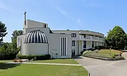 Den Bauplatz, ein vier Hektar großes Areal, auf freiem Feld etwas südwestlich von Maria Roggendorf stellte das Stift Melk zur Verfügung. 1979 wurde es als Wind- und Sichtschutz mit einer Bodenschutzanlage umpflanzt. Der Klosterbau wurde von 1976 bis 1982 nach Plänen des Architekten Walter Hildebrand erbaut. Der Klosterbau umschließt ringförmig den Innenhof (Kreuzgarten) und hat westlich und östlich zwei Flügelbauten: Der östliche Flügelbau ist die Apsis der Klosterkirche.[4] An der Westseite entstand in den Jahren 2001 bis 2002 ein dreiteiliger Anbau, in dem sich jetzt Refektorium, Bibliothek, Gemeinschaftsräume und Werkstätten befinden.