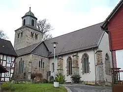 Der romanische Westturm war bereits Teil der ersten Kirche und wurde in der ersten Hälfte des 12. Jahrhunderts erbaut. Zwei der drei Bronzeglocken wurden 1971 in Gescher/Westfalen gegossen. Die dritte zählt zu den ältesten Bronzeglocken Deutschlands und ist eine der ältesten Kirchenglocken, die noch regelmäßig geläutet werden. Sie wurde im 12. Jahrhundert am Ort von durchziehenden Mönchen gegossen. Sie ist ohne Inschrift und Verzierung. Mit einer Höhe von 80 cm (ohne Krone) und einem Durchmesser von 83 cm hat sie ein Gewicht von 300 kg.