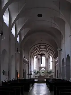 Die Klosterkirche Zum Heiligen Kreuz ist eine romanische Pfeilerbasilika aus dem 12. Jh. Die Vorhalle ist noch älteren Datums. Der spätgotische Chor wurde im 15. bis 16. Jahrhundert errichtet. Vom linken Seitenschiff getrennt ist die gotische Erasmuskapelle mit Taufstein, Wandfresko und Pietà-Gruppe von 1420. Das Hochaltarkreuz stammt aus dem Jahr 1508. Die barocken Gewölbe des Langhauses entstanden nach den Stadtbränden von 1662 und 1680. An den Langhauspfeilern sind gotische und barocke Figuren zu sehen. Im südlichen Querhaus befindet sich ein Monument der seligen Gisela sowie Grabdenkmäler des 14. bis 17. Jh.
