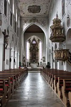 Blick durch das Kirchenschiff vom Chor mit Orgelprospekt