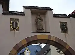 Die traufständigen Gebäude mit Satteldach gruppieren sich um den Torbogen und versperren den Zugang zum Klostergelände. Sie sind zweigeschossig und teilweise mit barocken Toreinfassungen ausgestattet. Die meisten von ihnen wurden im 20. Jahrhundert erneuert, was vor allem durch Dachgauben erkennbar ist.
