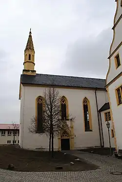 Die ehemalige Kirche des Klosters ist geostet. Sie ist einschiffig und hat als Saalkirche kein Querschiff.[17] Ein Walmdach mit einem aufgesetzten Dachreiter im Westen bedeckt das Langhaus. Der Verbindungsgang schließt sich im Süden an das Kirchengebäude an und teilt es in zwei Teile. Der größte Teil des Gebäudes wurde im Jahr 1606 fertiggestellt und ist deshalb der Spätgotik zuzuordnen. Lediglich die West- und die Südseite der Kirche wurden nach einem Brand im 19. Jahrhundert erneuert. Die Kirche ist der Heiligen Dreifaltigkeit und der Jungfrau Maria geweiht.[18]