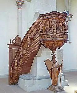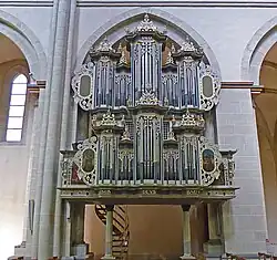 Besonders wertvoll ist der Orgelprospekt, den Heinrich Compenius der Jüngere vor 1619 für eine Schwalbennestorgel schuf und der in Teilen erhalten ist. Michael Praetorius überliefert 1619 in seinem Syntagma musicum die ursprüngliche Disposition mit 31 Registern auf drei Manualen und Pedal.[11] 1882 wurde diese Orgel abgelöst durch einen Neubau der Gebrüder Euler mit zwei Manualen und 21 Registern.[12] Teile des alten Prospekts wurden jedoch aufbewahrt. Die Orgelbaufirma Alfred Führer (Wilhelmshaven) baute 1979 ein neues Orgelwerk unter Einbeziehung der alten Prospektteile und in Anlehnung an die Disposition von Compenius. Das rein mechanische Instrument verfügt wieder über 31 Register, die auf drei Manuale und Pedal verteilt sind.[13] Kantor und Organist ist seit 2001 Hans-Dieter Karras.