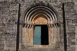 Das Hauptportal ist von fünf Archivolten eingefasst, die auf Säulen mit reich verzierten Kapitellen ruhen. Das Tympanon zeigt die von einem Nimbus umgebene Figur des Christus Pantokrator, die zu beiden Seiten von weiteren Personen flankiert wird. Unter den Füßen der Christusdarstellung zwei weitere Personen, die gemeinhin mit dem Apostel Judas und Arius in Verbindung gebracht werden.