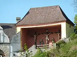 Den Kalvarienberg erreicht man über eine Treppe direkt bei der Klostertür. Die Figuren zeigen den Stilwandel vom Früh- zum Spätbarock.