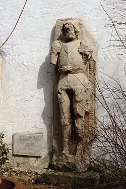 Im Treppenaufgang steht ein Gedenkstein des Jahres 1814, der ursprünglich an einer Weinbergsmauer auf der Escherndorfer Gemarkung angebracht war. Er zeigt den heiligen Laurentius, eine Inschrift nennt Lorenz Schlier und seine Frau als Stifter. Er wurde früher vom Bayerischen Landesamt für Denkmalpflege als Baudenkmal unter der Nummer D-6-75-174-224 geführt.[21]