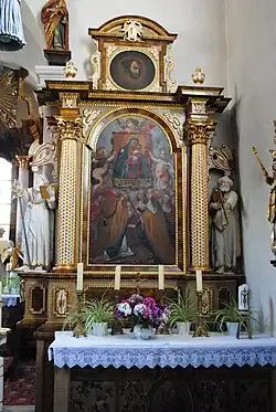 Zur Grundausstattung der Kirche gehört der schlichte Volksaltar, der zentral im Chor steht. Dahinter wurde als Ersatz für das fehlende Altarblatt ein buntes Chormittelfenster angebracht. Es zeigt in hellen Farben die Heiligste Dreifaltigkeit, die durch Jesus, die Taube des Heiligen Geistes und die Hand Gottes repräsentiert wird. Darunter, wesentlich dunkler gehalten, betet der heilige Augustinus inmitten von Weinreben.