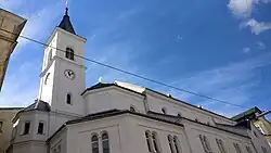 Die schlichte Emporenbasilika mit einer Giebelfassade im späthistoristischen Stil mit romanisierenden Formen mit einem eingezogenen Chor und einem angestellten Turm steht mit der nördlichen Längsfassade in der Straßenflucht der Hofzeile. Die Klosterkirche wurde von 1885 bis 1886 nach den Plänen des Architekten Friedrich Luckner erbaut und 1887 geweiht.