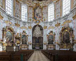 An der Ostseite führt ein Chorbogen in den querovalen Chorraum mit dem Hochaltar. Ein Deckengemälde Martin Knollers von 1769 zeigt die Aufnahme Marias in den Himmel. Das Obergeschoss des Chorraums ist mit Darstellungen der vier Kardinaltugenden ausgemalt, in dem Tonnengewölbe des Chorbogens schuf Martin Knoller 1784/85 eine Darstellung der drei Göttlichen Tugenden. Vier von Roman Anton Boos 1790 geschaffene Holzreliefs an den Wänden des Chorraums zeigen die Szenen Taufe, Verklärung, Kreuzigung und Auferstehung aus dem Leben Jesu.[5]