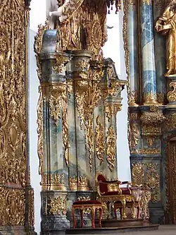 Auf den Sockeln stehen Statuen, links Martin von Tours, rechts Benedikt von Nursia; als Bildhauer wird Joseph Anton Hops vermutet. Das breit und fliessend wirkende Bandwerk besteht aus Akanthus- und Muschelmotiven. Zwischen dem Haupt- und dem Oberbild ist das geschnitzte Wappen des Fürstabtes Gerold Haimb zu finden.[39]