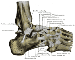 Zu wenig Beachtung finden außerdem funktionelle Aspekte des sogenannten „hinteren“ oder dritten „Malleolus“: Die weit über die Sprungbeinrolle greifende dorso-laterale Schienbeinkante mit der hier eingreifenden, straffen hinteren Syndesmose als Gelenklippe stellt besonders in Plantarflexion einen wesentlichen Kontaktpunkt des Gelenkes dar: Der im deutschen Sprachraum übliche Begriff Sprunggelenkgabel wird damit weder den anatomischen noch den physiologischen Fakten gerecht. Die Form der Sprunggelenkfläche des Schien- und des Wadenbeins wird deshalb insgesamt auch treffender im Englischen als Mortise, im Französischen als Mortaise bezeichnet. Napf oder Pfanne ist eine funktionsgerechte Eindeutschung.[1]