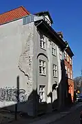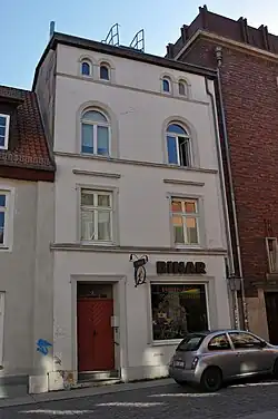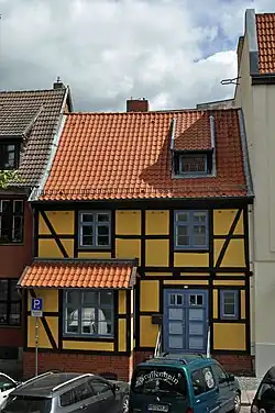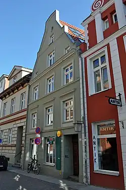 | 17 | Das Traufenhaus, das dreigeschossig und dreiachsig ausgeführt ist, wurde am Anfang des 18. Jahrhunderts durch Umwandlung eines mittelalterlichen Giebelhauses errichtet. Reste des mittelalterlichen Hauses sind in Form der Pilaster an der Mittelachse erhalten. Das Haus stand ab 1994 nur noch als Ruine; nur die Straßenfront, die Brandmauer zum Nachbarhaus Nr. 16 und der Hausbaum waren erhalten. Als „Stützenhaus“ war das Haus lange Zeit in der örtlichen Presse Gegenstand der Berichterstattung. Ab Juli 2010 wurde das Gebäude umfassend saniert und wiederhergestellt. | 436 |
