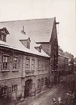 | 30 | Zum doppelten Anker | Ein älterer Name des Brauhauses war Zum schwarzen Hund. 1631 und auch noch 1661 gehörte es Hans Knape (auch Knabbe oder Knake). Im Jahr 1683 war der Eigentümer unbekannt. In der Zeit zwischen 1683 und 1688 wurde das Brauhaus, wohl nach den Zerstörungen von 1631, vom Schneider Konrad Tuchtfeld wieder aufgebaut. Er veräußerte es 1711 für 1460 Taler an den Rektor des städtischen Gymnasiums Gottfried Bergner, der bis 1732 Eigentümer blieb. In den 1930er Jahren lebten mehrere Menschen jüdischer Herkunft im Haus, so wahrscheinlich Regina Pressler und ihre Tochter Frieda. Sie wurden 1942 nach Auschwitz deportiert und dort ermordet.[22] Außerdem lebte hier das jüdische Ehepaar Mendel und Itta Pressler. Er wurde 1939 im KZ Buchenwald ermordet, sie 1943 in Auschwitz.[23] Vier Stolpersteine erinnern an sie, die jedoch weiter südlich an der Ecke zur Johannisbergstraße verlegt worden. |