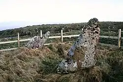Südlich des Bauernhofs stehen zwei etwa 2,4 m voneinander entfernte Menhire. Beide besitzen dreieckige Grundflächen mit Kantenlängen von 150 × 90 × 65 cm beziehungsweise 80 × 80 × 70 cm. Beide sind leicht geneigt und würden bei aufrechtem Stand 1,95 m beziehungsweise 1,7 m hoch aufragen.[3]