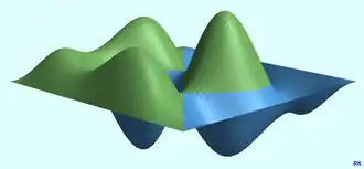 Eine Funktion zweier Variabler kann man darstellen, indem man sie zunächst in ein dreidimensionales (kartesisches oder polares) Koordinatensystem zeichnet. Über der Ebene wird der Funktionswert in Richtung der -Achse eingetragen. So ergibt sich als Bild typischerweise eine „Landschaft“ mit „Gebirgen“ und „Meerestiefen“. Dieses 3D-Bild wiederum kann man in die Ebene der Zeichnung bei unterschiedlicher Beleuchtung von verschiedenen Entfernungen und Blickwinkeln aus projizieren. Dieser Typ 3D-Darstellung ist verbreitet und im ursprünglichen Wortsinn „anschaulich“. Obwohl eine solche 3D-Darstellung eindrucksvoll sein kann, sind manche wichtigen Details schwer auszumachen, zum Beispiel: Wo sind denn nun die Grenzen von „Land“ und „Meer“, wo ist die Funktion größer und wo ist sie kleiner als Null?