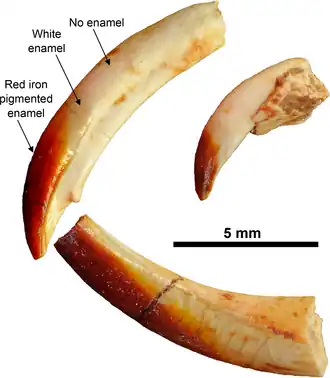 - ↑ a b c d T. Smith & V. Codrea: Red Iron-Pigmented Tooth Enamel in a Multituberculate Mammal from the Late Cretaceous Transylvanian “Haţeg Island”. In: PLoS ONE, Band 10, Nummer 7, 2015, Artikel e0132550, doi:10.1371/journal.pone.0132550.