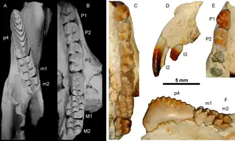 bereits deutlich reduziert. Im Oberkiefer sind nur noch zwei Paare von Schneidezähnen (I2 und I3) vorhanden. Schneidezähne auf der Position I1 fehlen ebenso wie Eckzähne (C). Vier Prämolaren (P1–P4) folgen zwei Molare (M1 und M2). Im Unterkiefer ist nur noch ein Schneidezahnpaar (i1) vorhanden. Auch hier fehlen die Eckzähne (c). Die unteren Prämolaren p1 und p2 fehlen bei allen Vertretern der Kogaionidae. Bei einigen der vollständiger bekannten Arten, wie etwa Barbatodon transylvanicus oder Kogaionon radulescui ist nachgewiesen, dass auch ein dritter unterer Prämolar (p3) fehlte. Bei anderen Formen, wie etwa Hainina belgica besteht die Möglichkeit, dass zumindest ein stark reduzierter, nicht mehr funktionaler p3 vorhanden war. Ein direkter Fossilbeleg dafür ist bislang jedoch noch nicht bekannt. Der vierte untere Prämolar (p4) ist stark vergrößert, bogenförmig aufgewölbt und mit einer sägezahnartigen Reihe von Höckern versehen. Daran anschließend sind noch zwei untere Molare (m1 und m2) vorhanden.[3][5][11]
