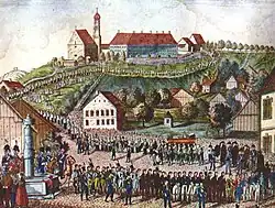 Leichenzug für den 1812 verstorbenen Fürstbischof Clemens Wenzeslaus, vom Marktplatz auf den Schlossberg, wo er in einer Grabkapelle an der Chorseite der Pfarrkirche St. Martin, neben dem Kurfürstlichen Sommerschloss, beigesetzt ist.