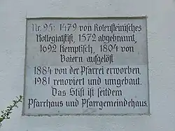 Das Kollegiatstift wurde von Ludwig von Rothenstein († 1482) im Jahre 1479 gestiftet.[2] In dieser Zeit wurde auch die sich in unmittelbarer Nähe befindliche Pfarrkirche St. Philipp und Jakob zur Stiftskirche umgewidmet. Das Kollegiatstift wurde für zwölf Kanoniker errichtet. Sie wählten aus ihren Reihen einen Stiftsdechanten.[3] Die Zahl von zwölf Kanonikern wurde jedoch nach den Anfangsjahren so gut wie nie mehr erreicht. Im Jahr 1525 flüchteten die Stiftsherren nach Kempten in das Gasthaus „Zum weißen Hund“ vor den aufständischen Bauern. Das Gebäude hatte der Stiftsdekan Konradus Rottmayr bereits 1503 erworben. Das Stift behielt dieses Gebäude bis 1695.[4] Das Stiftseinkommen wurde in der Stiftungsurkunde von Ludwig von Rothenstein festgelegt. Durch die Glaubensspaltung (römisch-katholisch und evangelisch-reformiert) in Grönenbach ab 1559 durch Philipp von Pappenheim wurden die Stiftseinnahmen zwischen den Konfessionen aufgeteilt.[5] Am 25. Februar 1572 brannte das Kollegiatstift ab und wurde in den anschließenden Jahren wieder errichtet.[6] Um das Kollegiatstift auch nach der Reformation in Grönenbach bewahren zu können, erwirkte Alexander von Pappenheim 1602 ein Konservatorium von Kaiser Rudolph II.[7] Im Jahre 1692 ging das als Lehen vergebene Kollegiatstift Grönenbach an den Kemptener Fürstabt Rupert von Bodman zurück.[6] Rupert von Bodman nahm das Kollegiatstift am 1. und 2. Januar 1692 feierlich und mit großem Gefolge in Besitz.[8] Im Zuge der Säkularisation in Bayern 1803 wurde auch das Kollegiatstift am 14. Mai 1804 aufgehoben.[9] Das Stiftsgebäude wird heute als Pfarrhof der römisch-katholischen Gemeinde in Bad Grönenbach genutzt.