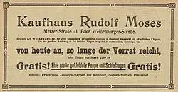 An der Weißenburger Ecke Metzer Straße 41 eröffnete der Kaufmann Rudolf Moses 1886 eine Posament-Waarenhandlung. In den 1890ern zweigeschossig ausgebaut, war sie eine der größten Stoff- und Wäschehandlungen des Bezirks. 1895 expandierte Moses und gründete das große Kaufhaus R. & S. Moses am Weddingplatz, das Geschäft Ecke Weißenburger Straße nannte er später Kaufhaus Rudolf Moses, bei der Geschäftsaufgabe 1918 hieß es Kaufhaus zum Stern. 1919 erfolgte im Erdgeschoss ein Umbau zum Kino, das bis 1949 unter den Namen Union Theater und Lichtspiele am Senefelderplatz betrieben wurde. Seit 1959 werden die Räume als Kindertagesstätte genutzt,[42] mit Eingang an der Kollwitzstraße 16.