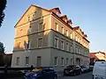 Der Bau ist zweigeschossig ausgeführt; die Fassade zeigt einen gegiebelten Mittelrisalit, eine Putzgliederung mit angedeuteter Kolossalordnung, einen Kniestock und acht Fensterachsen. Die Bausubstanz ist weitgehend original erhalten. |