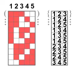 ist die Menge aller Kombinationen ohne Wiederholung von Objekten zur Klasse und hat die oben angegebene Anzahl von Elementen. Eine alternative Darstellung dieser Menge ist