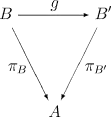 Analog können wir identisch und terminal wählen. Wir erhalten dann die Kategorie der Objekte über (wobei das durch ausgewählte Objekt von ist). Diese Kommakategorie notieren wir als ; in der algebraischen Geometrie ist die Bezeichnung üblich. Sie ist das duale Konzept zu Objekten unter . Die Objekte sind Paare mit ; dabei steht für Projektion auf . Ein Pfeil in der Kommakategorie mit Quelle und Ziel wird durch eine Abbildung gegeben, die das folgende Diagramm kommutieren lässt: