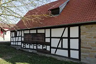 Der eingeschossige Fachwerkbau, der in weiten Teilen in Backstein erneuert wurde, hat ein Satteldach.