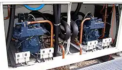 Als Kompressoren kommen hauptsächlich und in der Reihenfolge steigender Kälteleistung Rollkolben, Scrollverdichter, Hubkolbenverdichter, Schraubenverdichter und Turboverdichter zum Einsatz.