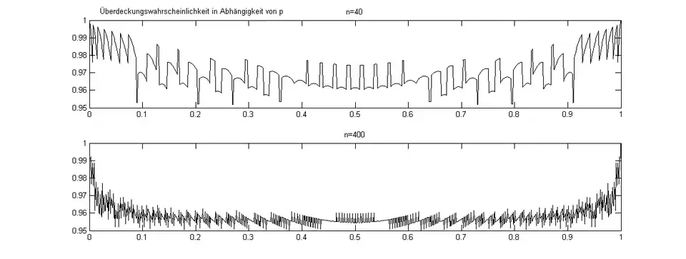 Ist das Konfidenzintervall zu Erfolgen, so verlangt man laut Definition, dass für alle die Überdeckungswahrscheinlichkeit größer oder gleich ; ist. Bei stetigen Verteilungen lassen sich Konfidenzintervalle finden, so dass hier Gleichheit vorliegt (also statt ). Dies ist für die diskrete Binomialverteilung nicht möglich. In folgender Abbildung ist die Überdeckungswahrscheinlichkeit in Abhängigkeit von dargestellt. Das Clopper-Pearson-Intervall wird übrigens deshalb exakt genannt, weil es eine Überdeckungswahrscheinlichkeit sicherstellt, die für alle tatsächlich größer oder gleich dem geforderten Konfidenzniveau ist. Für die anderen oben besprochenen Approximationen ist das nicht der Fall: hier gibt es oft Überdeckungswahrscheinlichkeiten, die kleiner sind als das geforderte Niveau!