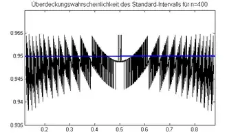 Wenn diese Formel verwendet wird, sollte und sein. Trotzdem kann die Verwendung des Standard-Intervalls problematisch sein. In der Abbildung ist als Beispiel die Überdeckungswahrscheinlichkeit für und illustriert. Sie liegt oft unter dem geforderten Niveau von 0,95.