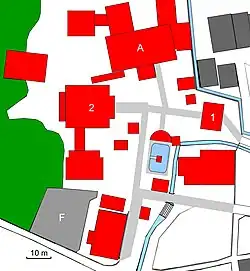 Im Norden befindet sich das Abt- und Mönchsquartier (A), im Süden der Friedhof (F).
