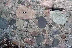 Konglomerate werden teilweise auch als Nagelfluh (siehe unten) und historisch als Pudding- oder Wurststein bezeichnet.[1][2] Der Begriff Wurststein leitete sich von der Ähnlichkeit der Textur des Anschliffs eines Konglomerats mit der Textur einer angeschnittenen Blutwurst ab, (grobere Fleisch- und Speckstücke in einer dichten, optisch homogenen Grundmasse).[3] Den gleichen Hintergrund hat die Bezeichnung Puddingstein. Sie ist aus dem Englischen entlehnt und bezieht sich auf die Ähnlichkeit zum britischen Pudding[4] (vgl. insbesondere Blutpudding).