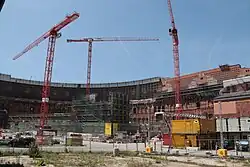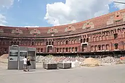 Die Struktur des Gebäudes war drei- bzw. vierteilig geplant: der Hauptbau mit einer Grundfläche von 275 mal 265 Metern (in ihm die Haupthalle, heute Innenhof, 180 mal 160 Meter) und einer geplanten Höhe von 68,5 Metern (39 Meter verwirklicht), zwei Vorbauten 24 mal 57 Meter und eine nicht mehr begonnene Vorhalle mit Mitteltrakt.[1] Die überbaute Fläche beträgt heute ca. 75000 m2 (inkl. ca. 28500 m2 Innenhof), die Brutto-Grundfläche des bestehenden Gebäudes (ohne Innenhof) ca. 118000 m2.[2] Der Rundbau (ohne die Vorbauten) zeigt außen 67 Achsen und damit 138 Fenster sowie 69 Zugangstore (letztere heute größtenteils zugemauert). Die beiden Vorbauten zeigen auf der Längsseite (Nordost) jeweils 17 Achsen.