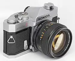 1960 baute Konica seine erste Spiegelreflexkamera F: sie hatte einen Metallschlitzverschluss mit einer kürzesten Belichtungszeit von 1/2000 Sekunde und einer Blitzsynchronisationszeit von 1/125 Sekunde.[13] 1963 kam die erste Kleinbildkamera der Welt mit Belichtungsautomatik und CdS-Belichtungsmessung (Konica Auto S) auf den Markt, von der es später auch eine Variante mit besonders lichtstarkem, siebenlinsigem 1:1,6-Objektiv gab (Auto S1.6).[14][15]