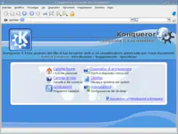 Konqueror wurde in KDE in dessen Version 2 eingeführt, welche am 23. Oktober 2000 erschien.[11] Darin löste Konqueror den KDE file manager (KFM) als Standard-Dateimanager ab. In KDE 4 (veröffentlicht am 18. August 2006) wurde Konqueror als vorgegebener Dateimanager durch Dolphin ersetzt. Konqueror bietet weiterhin Dateimanagerfunktionalität, indem nun Dolphin als KPart eingebunden wird.