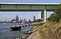 Die Anlage der Rheinuferstraße selbst ließ Stübben zwischen 1892 und 1898 durchführen. Den Schutz des linken Rheinufers zwischen den Eckbastionen hatten vier ab 1891 erbaute Kaponnieren zu übernehmen, von denen zwei im Norden der Uferstraße errichtet wurden. Alle Anlagen waren nach dem verlorenen Ersten Weltkrieg von der erzwungenen Entfestigung betroffen und blieben nur als Stümpfe ihres Sockelmauerwerks erhalten.[27]
