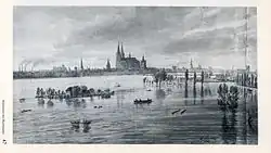Die schwersten Hochwasserschäden erlitten die Stadt und damit im Besonderen Maße die Bereiche des Rheinufers im Jahr 1784. Damals wurde mit 13,55 m Pegelhöhe der höchste jemals registrierte Wasserstand des Rheins in Köln erreicht.[10] Bei dieser auch als Jahrhunderthochwasser bezeichneten Katastrophe wurde unter anderem auch die „Ark“, der in den Rhein ragende Wartturm an der Nordecke der Stadtmauer zerstört.[5] Diese Katastrophen wiederholten sich häufig, so auch in den Jahren 1926, 1930 und 1948. Erst danach wurden im Rahmen einer umfassenden Neugestaltung der Rheinuferstraße auch relativ wirksame Wasserschutzmaßnahmen durchgeführt.