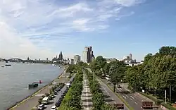 Vor der Einmündung der Ringstraße entstand 1924 ein Bauwerk von Wilhelm Riphan, welches er im sich ausbreitenden expressionistischen Baustil der deutschen Nachkriegszeit gestaltete. Sein Entwurf setzte auf dem vorhandenen zweigeschossigen Unterbau einer ehemaligen preußischen Festungsanlage auf und wurde von ihm analog dieser Anlage (oben als Kaponiere erwähnt) als Bastei benannt. Die Stahlkonstruktion des aufgesetzten Bauwerkes war wie heute ebenerdig von der Straßenseite zu betreten und bot durch das weit über den Versorgungsweg der unteren Kaianlagen auskragende Obergeschoss einen 180°-Blick über den Rhein. Riphahns Bastei wurde als exklusives Panoramarestaurant bewirtschaftet und blieb an diesem Straßenabschnitt das einzige unmittelbar am Ufer errichtete größere Bauwerk.[38]