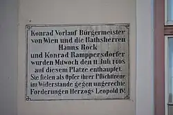 Konrad Vorlauf war ab 1399 bis 1403 Mitglied des Inneren Rates der Stadt Wien und 1403–1404 Bürgermeister Wiens. Danach war er wieder Ratsherr, ab 1406 jedoch abermals Bürgermeister[1]. Wie die bürgerliche und politische Elite der Stadt unterstützte er Herzog Ernst den Eisernen im Konflikt gegen seinen Bruder Leopold IV. um das Habsburgererbe. Das ärmere Wien sowie das Handwerk unterstützten jedoch Leopold. Als sich die beiden Brüder 1408 mit ihrem Gefolge nördlich von Wien gegenüberstanden, wurde versucht, in Wien einen Aufstand zugunsten Leopolds anzuzetteln. Vorlauf ließ die Rädelsführer fassen und am 5. Jänner öffentlich hinrichten.