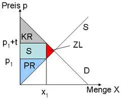 Als Folge der Steuer nimmt sowohl die Konsumentenrente, als auch die Produzentenrente ab. Die Konsumentenrente sinkt, weil die Konsumenten einen Teil der Steuerlast zahlen müssen (der Preis ist gestiegen) und weil die Konsumenten weniger konsumieren als im natürlichen Gleichgewicht. Die verlorenen Renten werden durch das blaue Rechteck und das rote Dreieck dargestellt. Das blaue Rechteck fällt dem Staat als Steuereinnahmen zu, das rote Dreieck geht dabei völlig verloren. Es wird als dead-weight-loss oder auch Wohlfahrtsverlust bezeichnet.