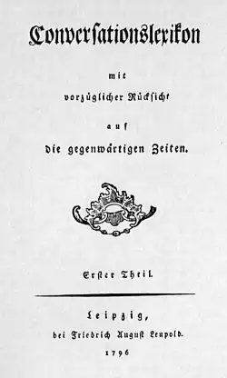 Als Konversationslexikon (erstmals benutzt wurde das Wort Conversations-Lexicon 1708 als „Sprachgebrauch der galanten Zeit“[1]) bezeichnet man eine im 18. Jahrhundert entstandene Gattung lexikografischer Nachschlagewerke, deren spezifisches Anliegen es ist, Wissen allgemeinverständlich, aber umfassend darzustellen.