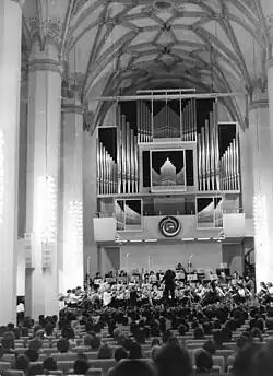 Die große Orgel wurde im Jahre 1975 errichtet. Das Schleifladen-Instrument hat 50 Registern (3.964 Pfeifen) auf drei Manualwerken und Pedal. Der Prospekt ist nach dem Werksprinzip gestaltet. Die Spieltrakturen sind wahlweise mechanisch und elektrisch, die Registertrakturen sind elektrisch.[6]