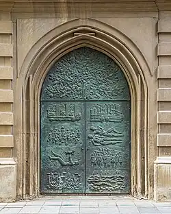 Das rechteckige Gebäude mit Satteldach ist ein dreischiffiger gotischer Backsteinbau mit sechs Jochen. Die beiden Giebel sind verputzt. Der Westgiebel ist mit Mustern aus Backsteinen verziert. Der einschiffige, gerade geschlossene Chor ist dreijochig ausgeführt und drei Meter niedriger als das Langhaus. Dessen Giebel ist mit gotischen Fensterformen gestaltet. Die Nord- und Südseite des Langhauses sind mit sechs Fenstern und die Westseite mit drei Fenstern gegliedert, die über die gesamte Höhe der Fassade gehen. An der Südseite befinden sich zwei doppelflüglige Tore. Von den zwei 2,90 m hohen, von Axel Schulz gestaltete Bronzetoren wird das eine „Heiteres Tor“ und das andere „Ernstes Tor“ genannt. Jede der vier Torflügel hat vier Felder mit Motiven. Den oberen Abschluss bildet bei beiden Toren ein halbkreisförmiger Rundbogen, der als Baum gestaltet ist. Im Norden schließt sich auf der gesamten Länge ein zweigeschossiger Funktionsanbau mit Atrium an.