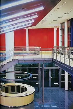 Im über den Haupteingang an der Brückstraße zugänglichen „Stadtfoyer“[83] befinden sich eine Bar, Garderoben und die Abendkasse. Von hier ist der freistehende, durch zwei Betonpfeiler gehaltene Konzertsaal im ersten Stock ersichtlich, der über Treppen oder Fahrstühle erreichbar ist. Die inneren Räumlichkeiten wurden vom Maler Oliver Jordan gestaltet; so zieren die Foyers übergroße Ölporträts von Gustav Mahler, Arnold Schönberg und Igor Strawinsky.[96]