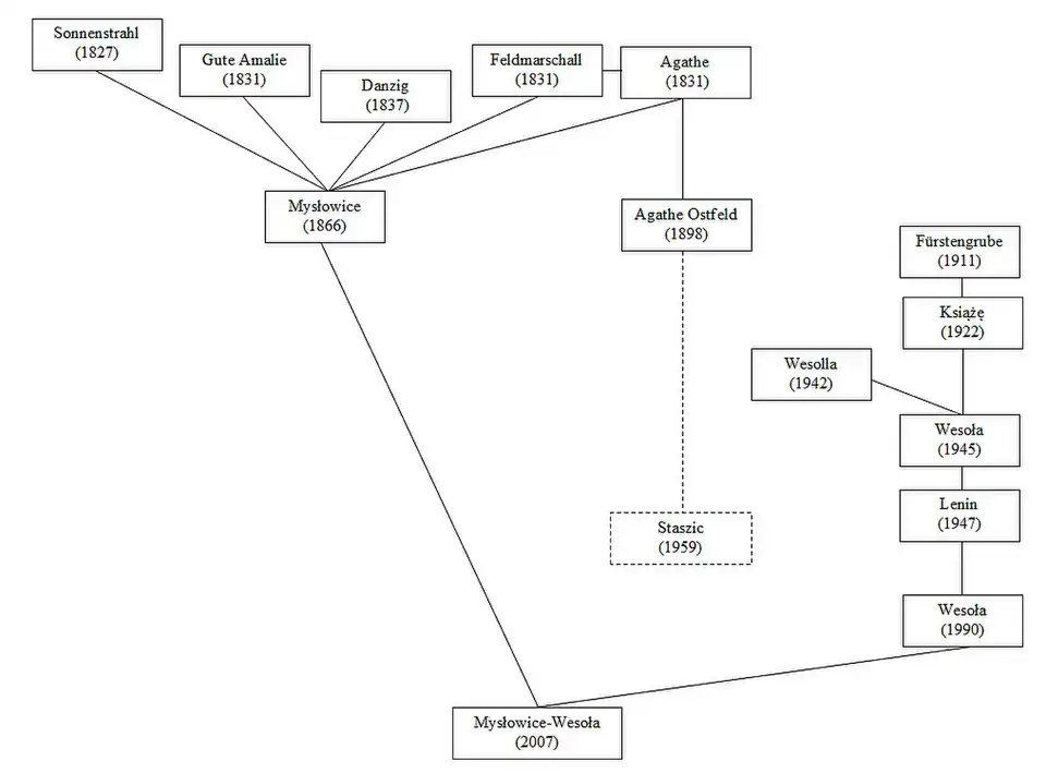 Das Verbundbergwerk Mysłowice-Wesoła hat sowohl von seiner geografischen Lage als auch seinen Besitzverhältnissen her keine einheitliche Geschichte. Während das im Norden liegende Bergwerk zur Herrschaft Myslowitz-Kattowitz gehörte und sich über viele Jahrzehnte hinweg im Besitz der von der Familie Tiele-Winckler beherrschten Kattowitzer AG für Bergbau und Eisenhüttenbetrieb befand, gehörten das südlich gelegene Vorgängerbergwerk von Wesoła und seine Berechtsame zum Fürstentum Pleß. Zu den vielfältigen Wurzeln siehe die nebenstehende Übersicht.